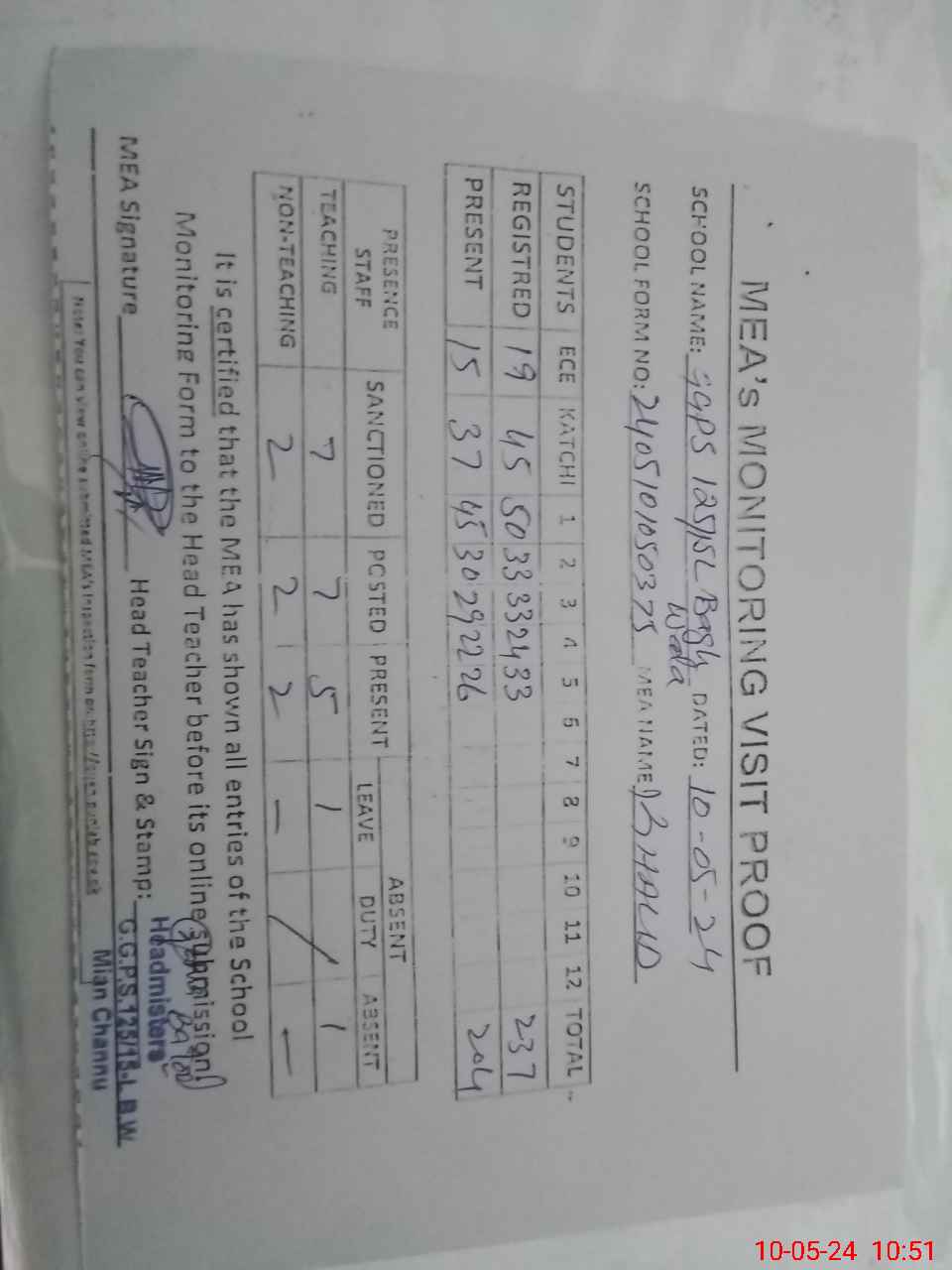 | Attendance Register | Head Teacher | MEA with School | Visit Proof |