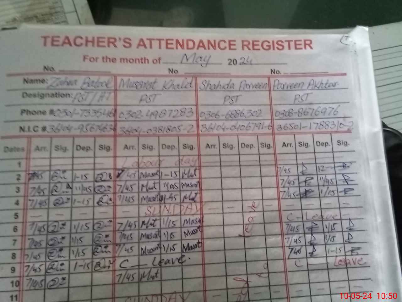 | CNIC | Full Name | Designation | R/C | Absence During Last Calender Month |