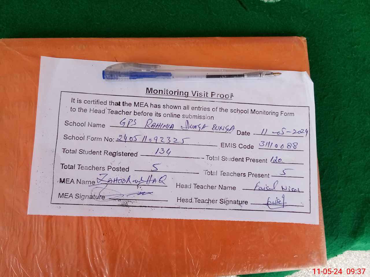 | Attendance Register | Head Teacher | MEA with School | Visit Proof |