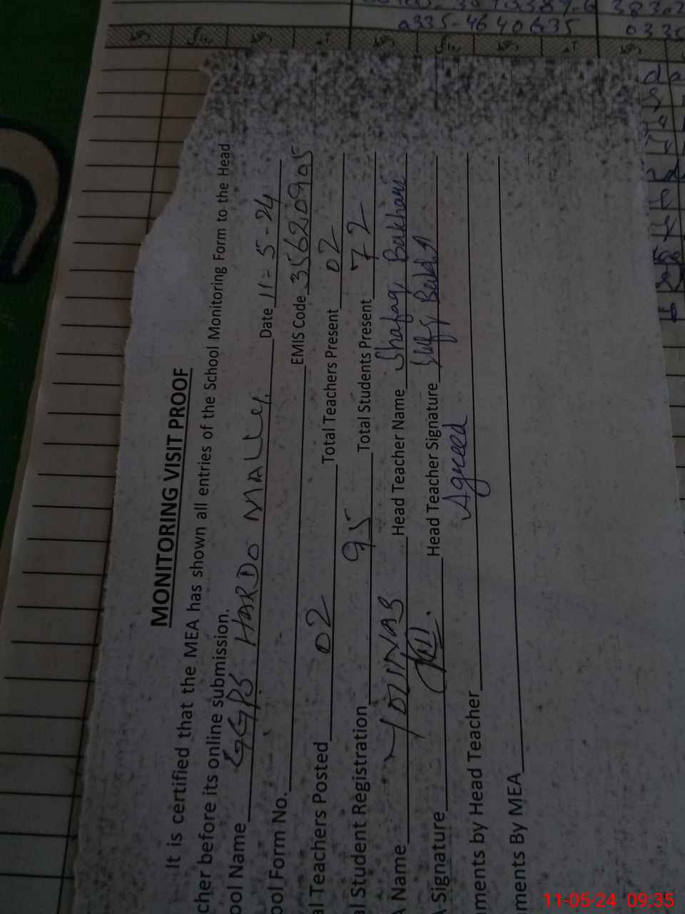 | Attendance Register | Head Teacher | MEA with School | Visit Proof |