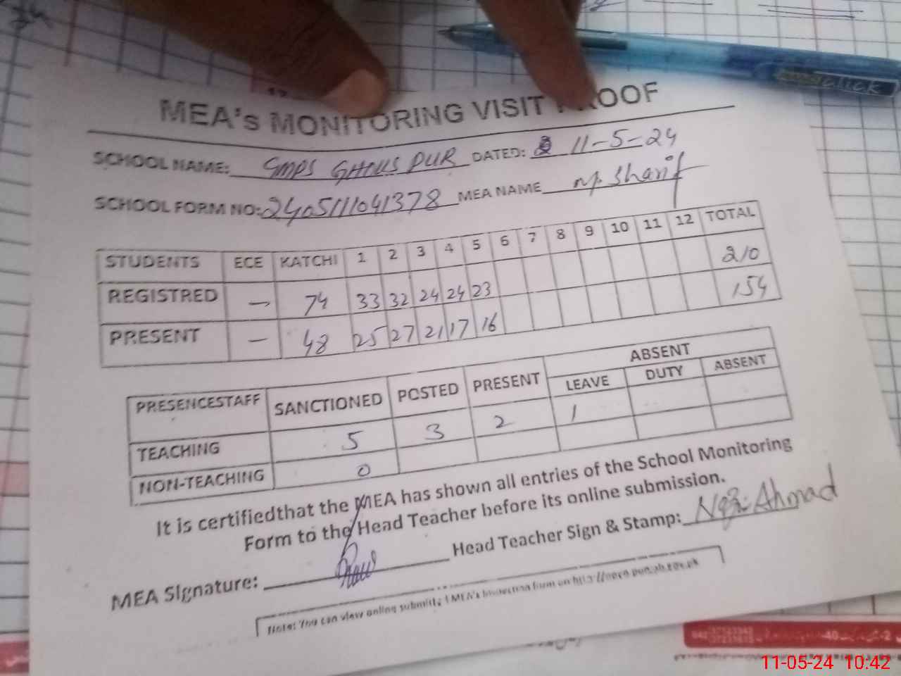 | Attendance Register | Head Teacher | MEA with School | Visit Proof |