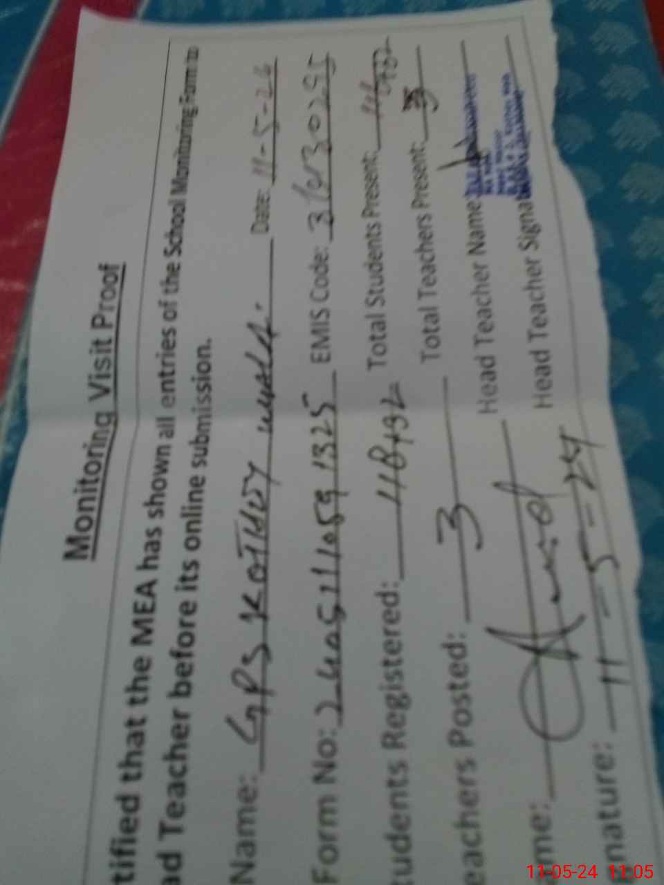 | Attendance Register | Head Teacher | MEA with School | Visit Proof |