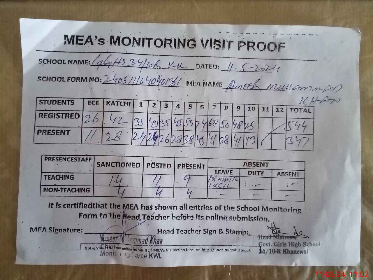 | Monitoring Date: 11-05-2024 | Start Time: 11-05-2024 10:06 AM | End Time: 11-05-2024 11:17 AM | Name of MEA: Am**** Mu**** Kh**** | |