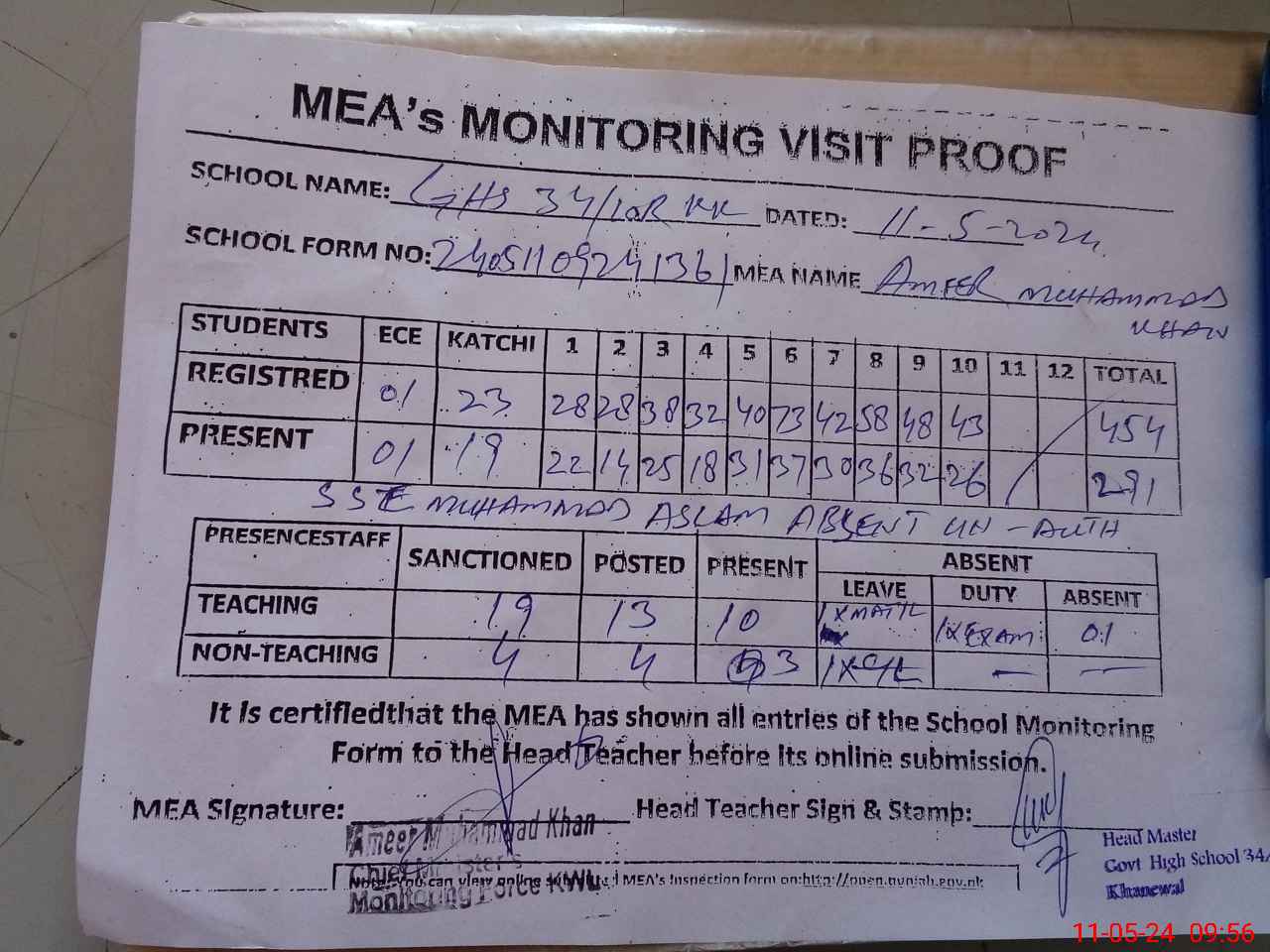 | Monitoring Date: 11-05-2024 | Start Time: 11-05-2024 09:00 AM | End Time: 11-05-2024 09:56 AM | Name of MEA: Am**** Mu**** Kh**** | |