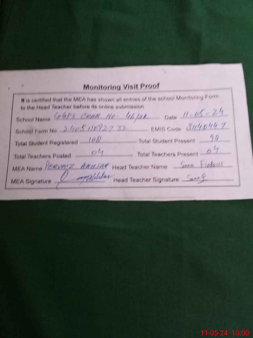 | Attendance Register | Head Teacher | MEA with School | Visit Proof |