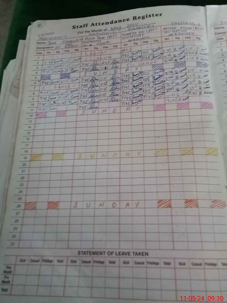 | Leave | Duty | Absent | Maternity | Medical | Ex- Pak |