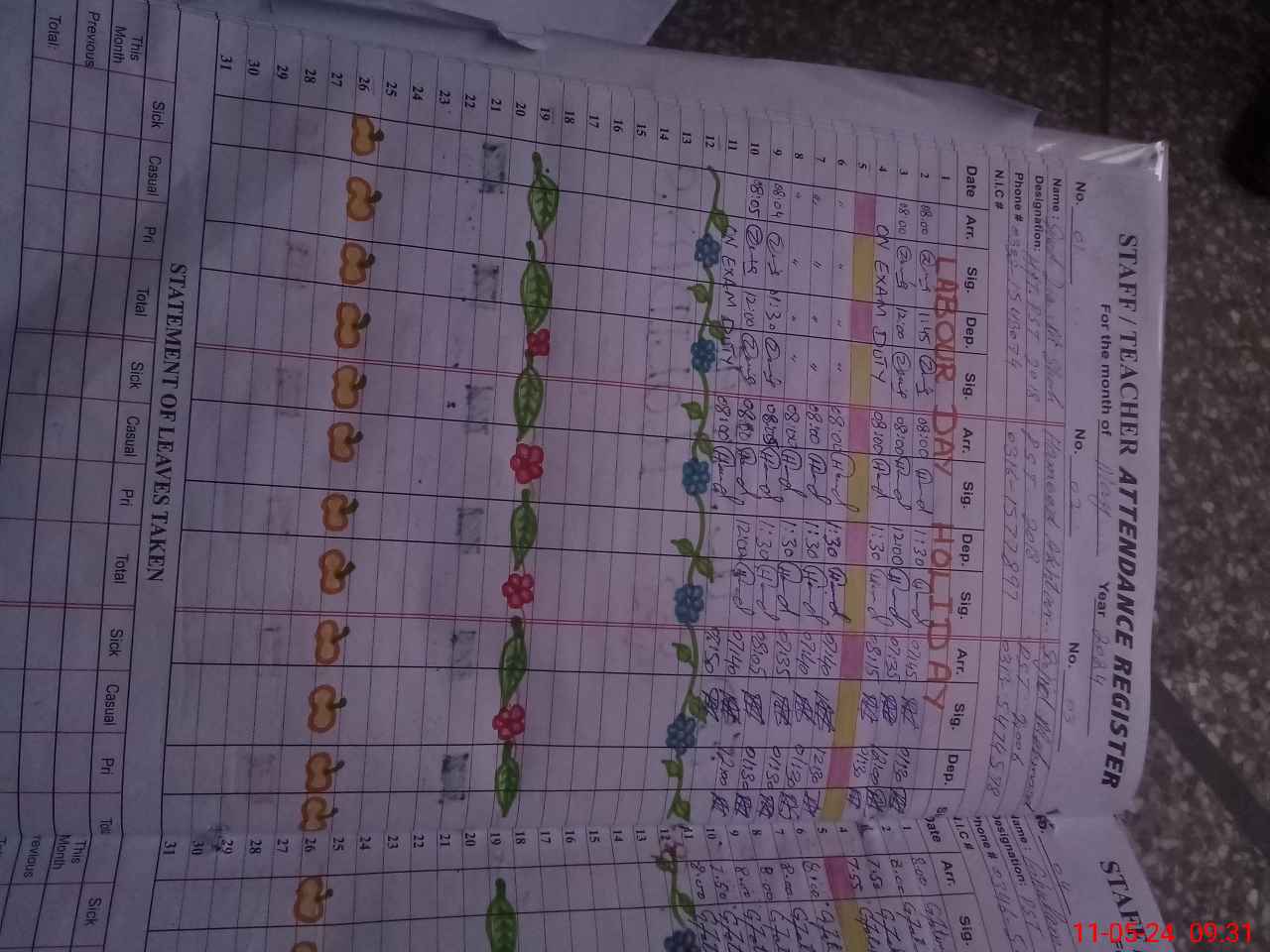 | CNIC | Full Name | Designation | R/C | Absence During Last Calender Month |