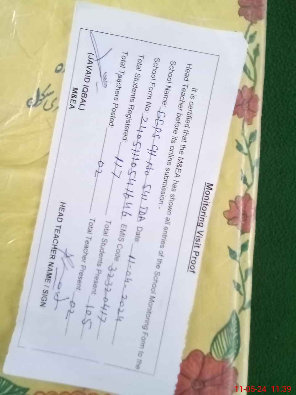 | Name: IS**** SH**** Designation: (School Headmaster's/Headmistress's) Ese Phone/Cell Number: 03**** |