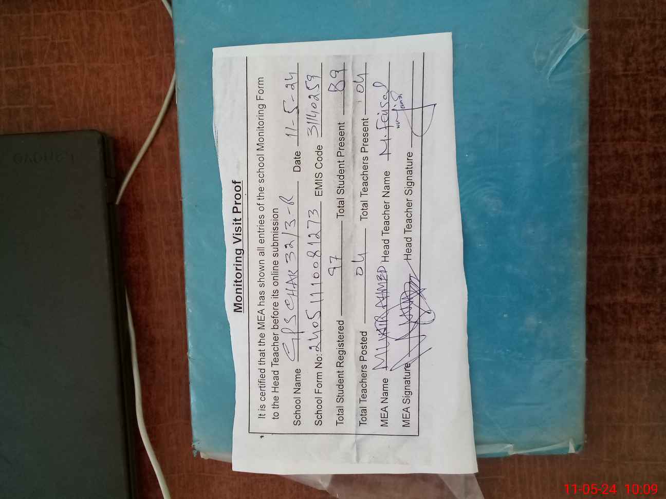 | Attendance Register | Head Teacher | MEA with School | Visit Proof |