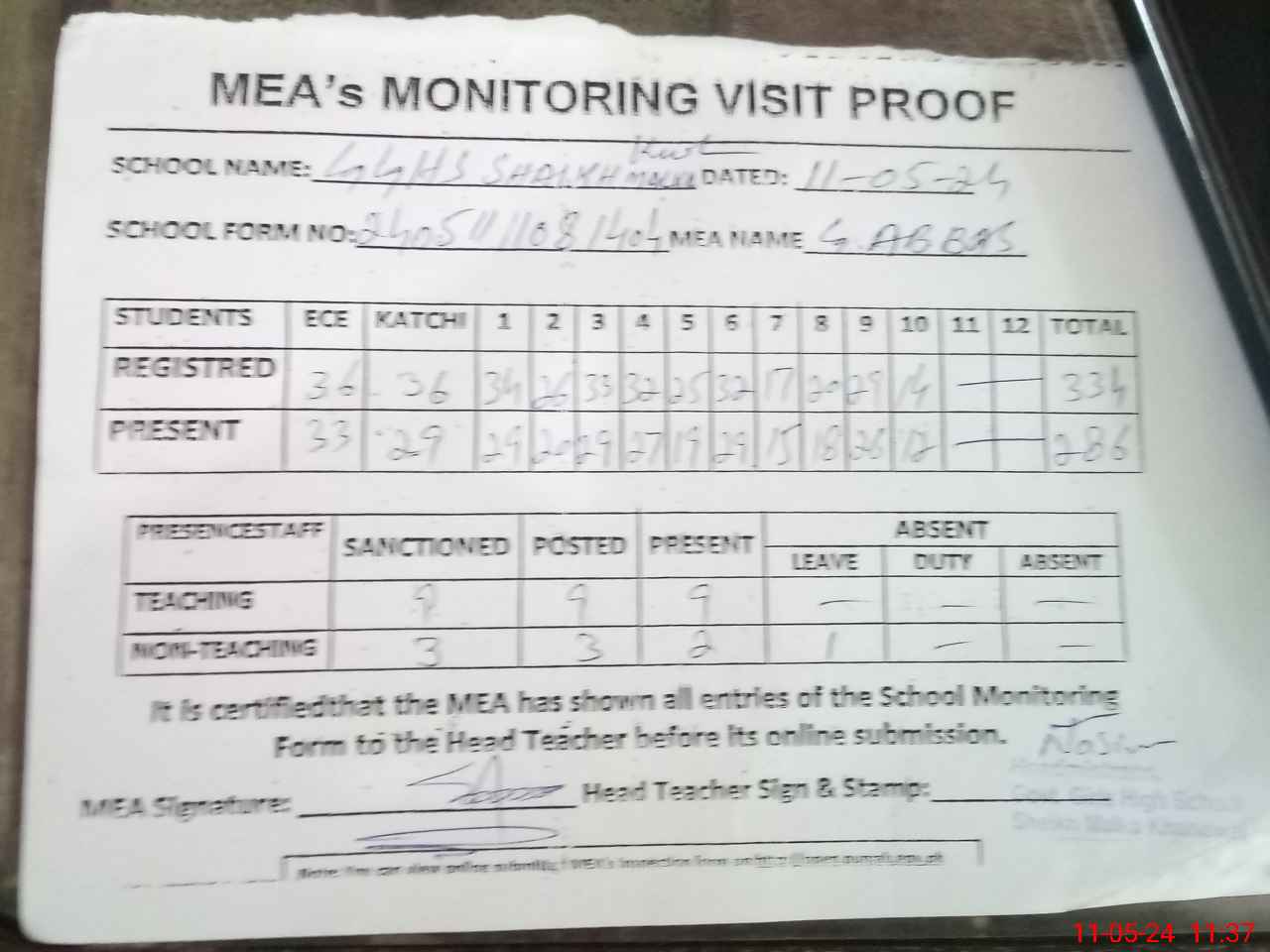 | Attendance Register | Head Teacher | MEA with School | Visit Proof |