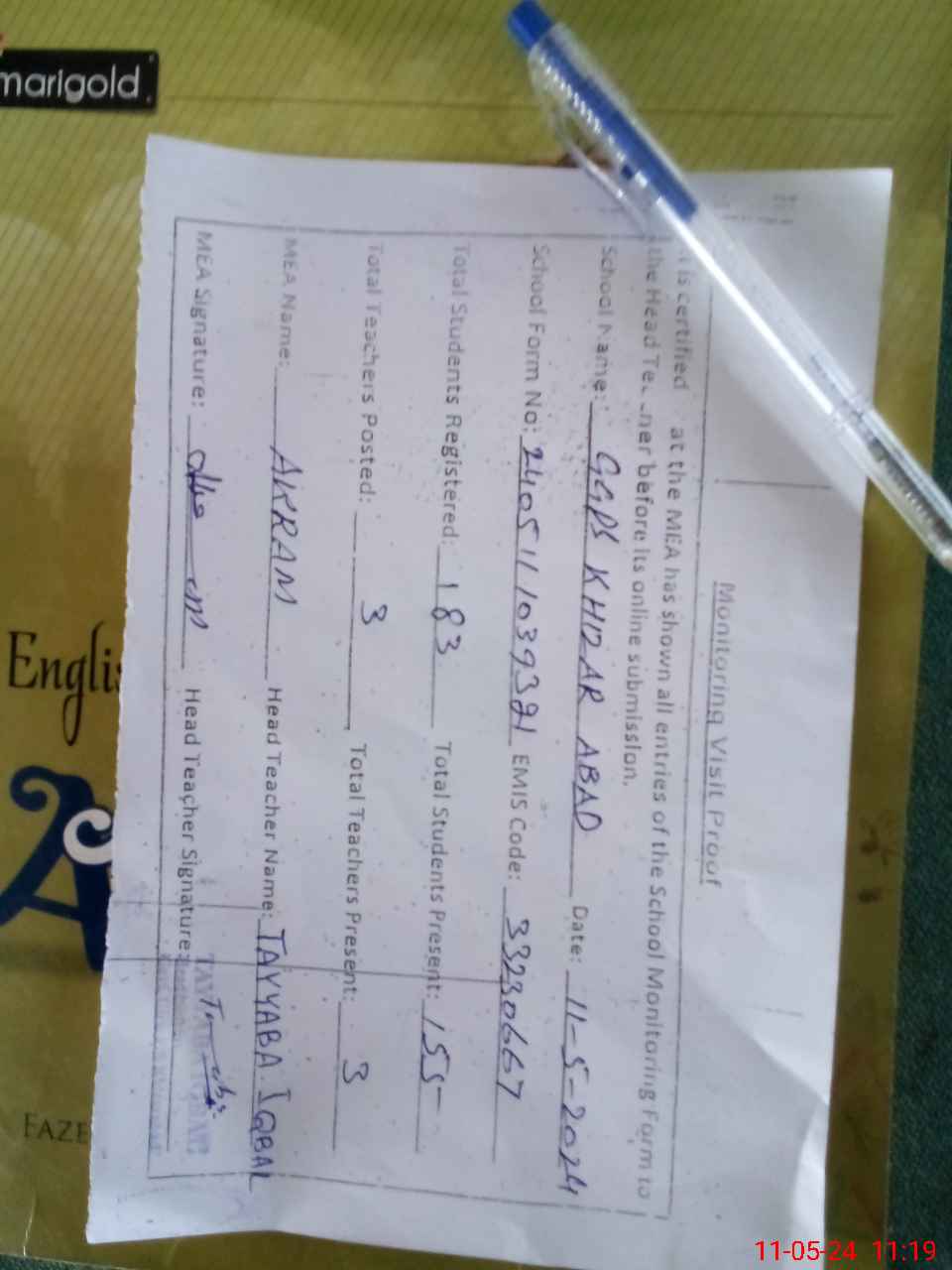 | Attendance Register | Head Teacher | MEA with School | Visit Proof |