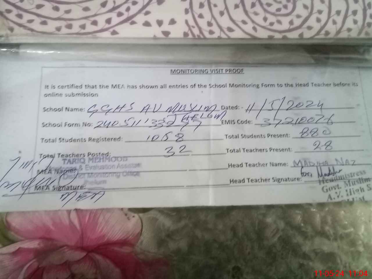 | Certified that this School was Inspected by the Undersigned MEA/DMO Today and the Information Stated Above is as Per Record. | |||||