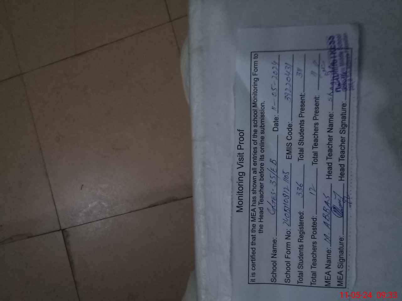 | Attendance Register | Head Teacher | MEA with School | Visit Proof |