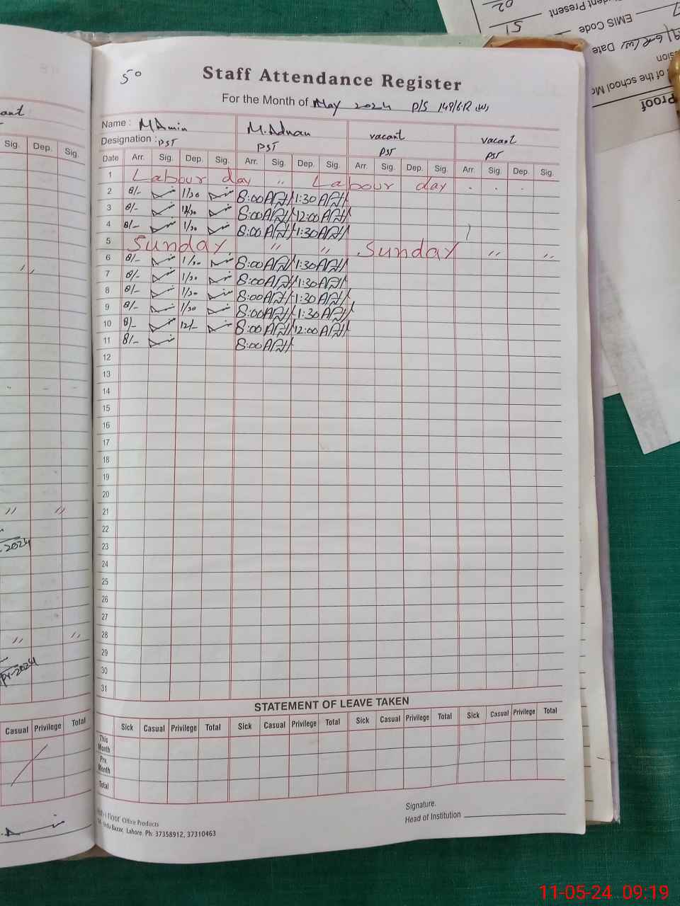 | Leave | Duty | Absent | Maternity | Medical | Ex- Pak |