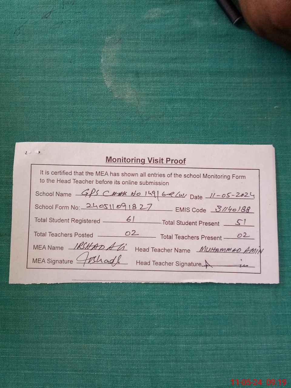 | Attendance Register | Head Teacher | MEA with School | Visit Proof |