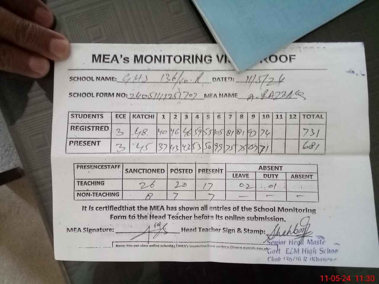 | Attendance Register | Head Teacher | MEA with School | Visit Proof |