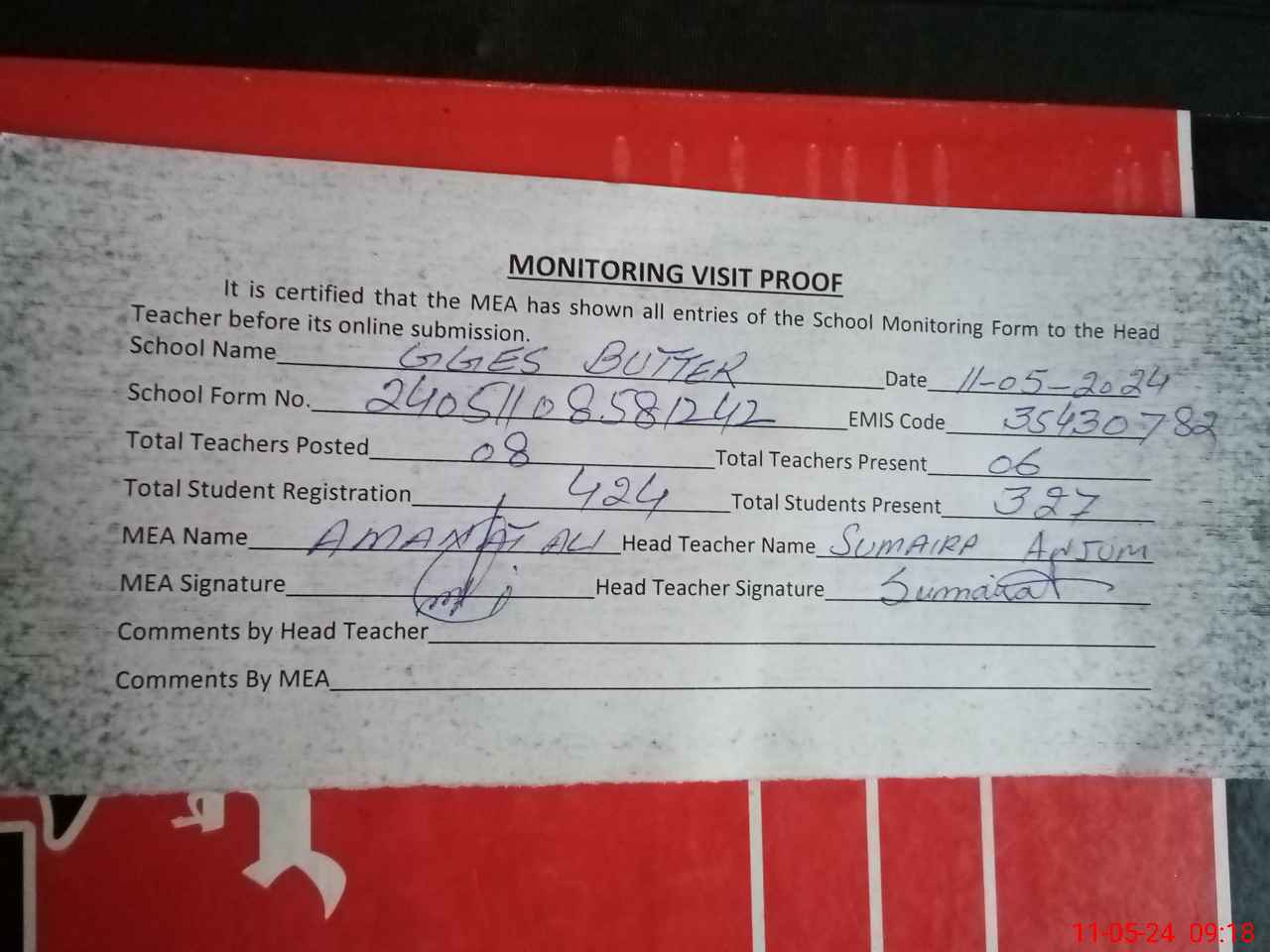 | Attendance Register | Head Teacher | MEA with School | Visit Proof |