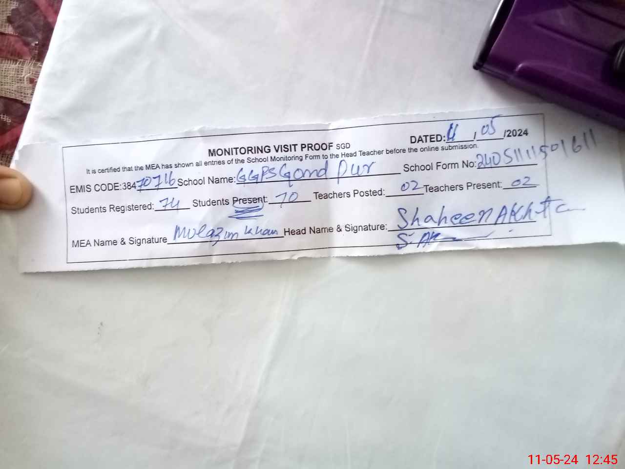 | Attendance Register | Head Teacher | MEA with School | Visit Proof |