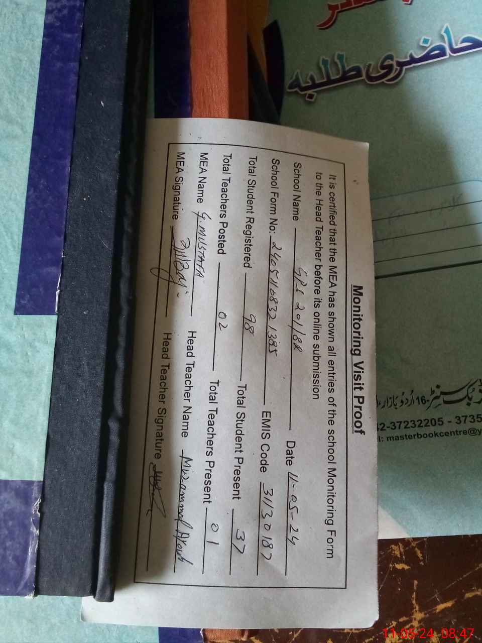 | Attendance Register | Head Teacher | MEA with School | Visit Proof |