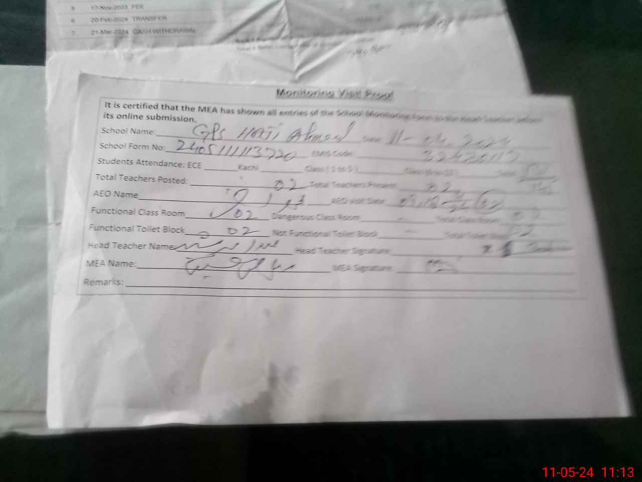 | Certified that this School was Inspected by the Undersigned MEA/DMO Today and the Information Stated Above is as Per Record. | |||||