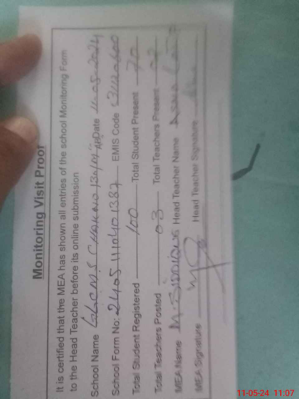 | Attendance Register | Head Teacher | MEA with School | Visit Proof |