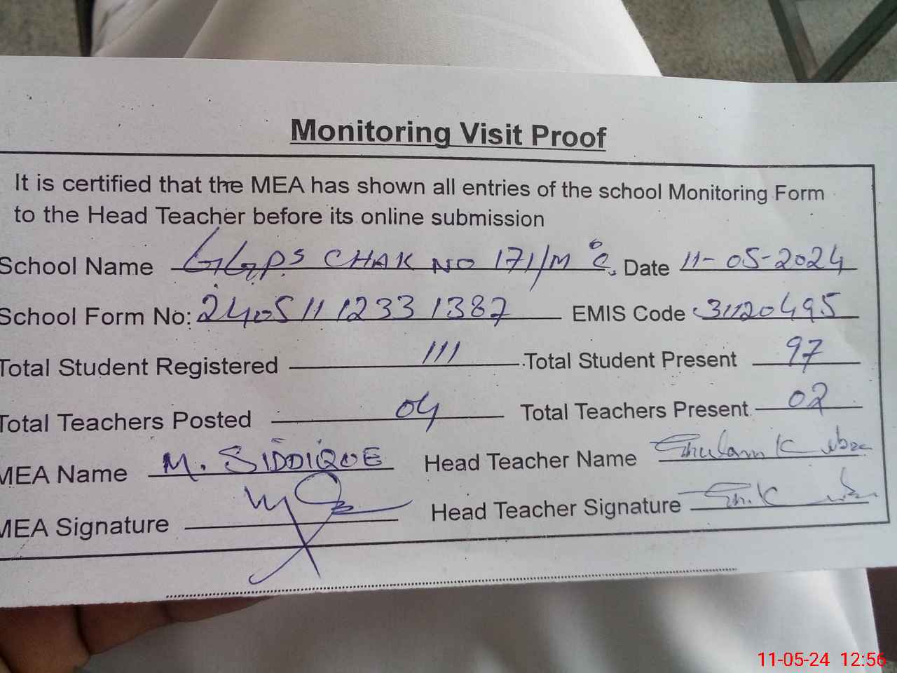 | EMIS Code: 31120495 | Name of School: GGPS CHAK NO. 171/MURAD (C) | |||