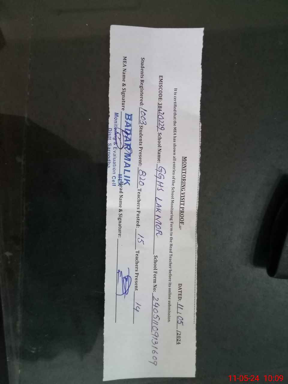 | Certified that this School was Inspected by the Undersigned MEA/DMO Today and the Information Stated Above is as Per Record. | |||||