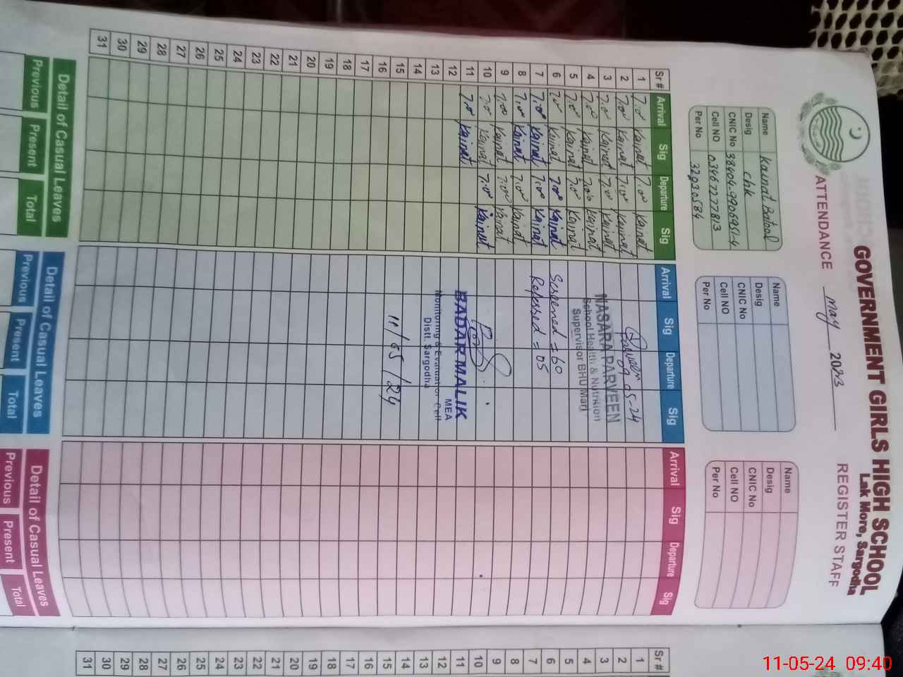 | CNIC | Full Name | Designation | R/C | Absence During Last Calender Month |
