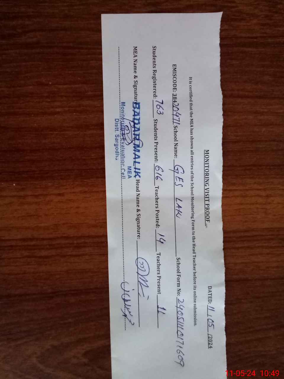 | Certified that this School was Inspected by the Undersigned MEA/DMO Today and the Information Stated Above is as Per Record. | |||||