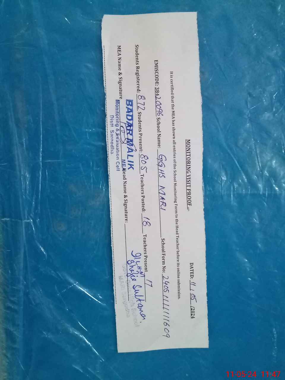 | Certified that this School was Inspected by the Undersigned MEA/DMO Today and the Information Stated Above is as Per Record. | |||||