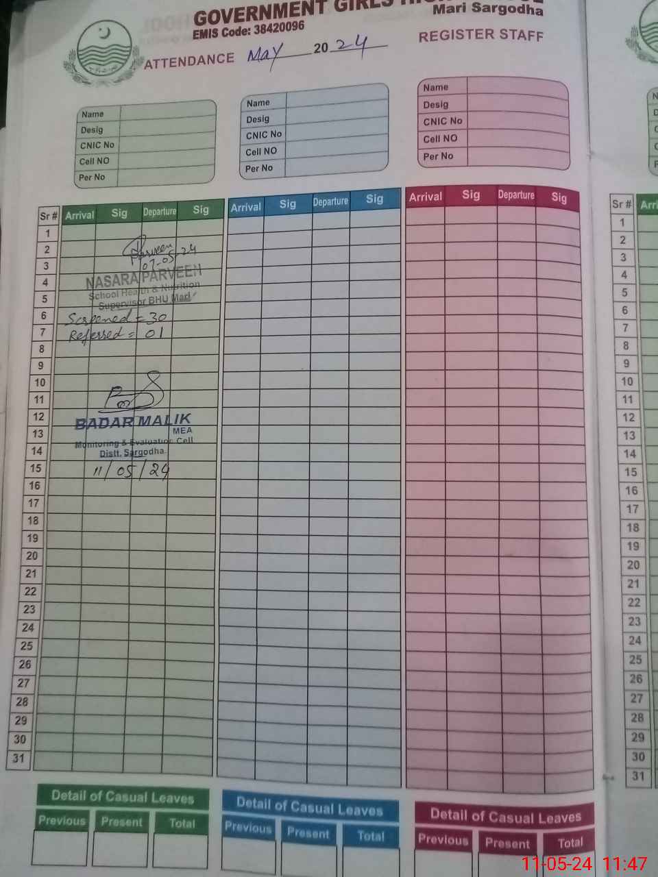 | CNIC | Full Name | Designation | R/C | Absence During Last Calender Month |