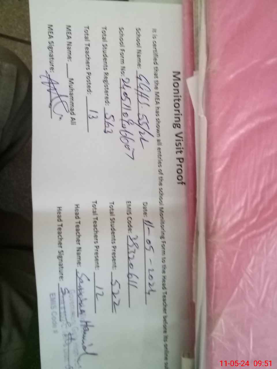 | Attendance Register | Head Teacher | MEA with School | Visit Proof |