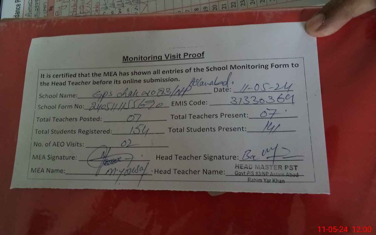 | Attendance Register | Head Teacher | MEA with School | Visit Proof |