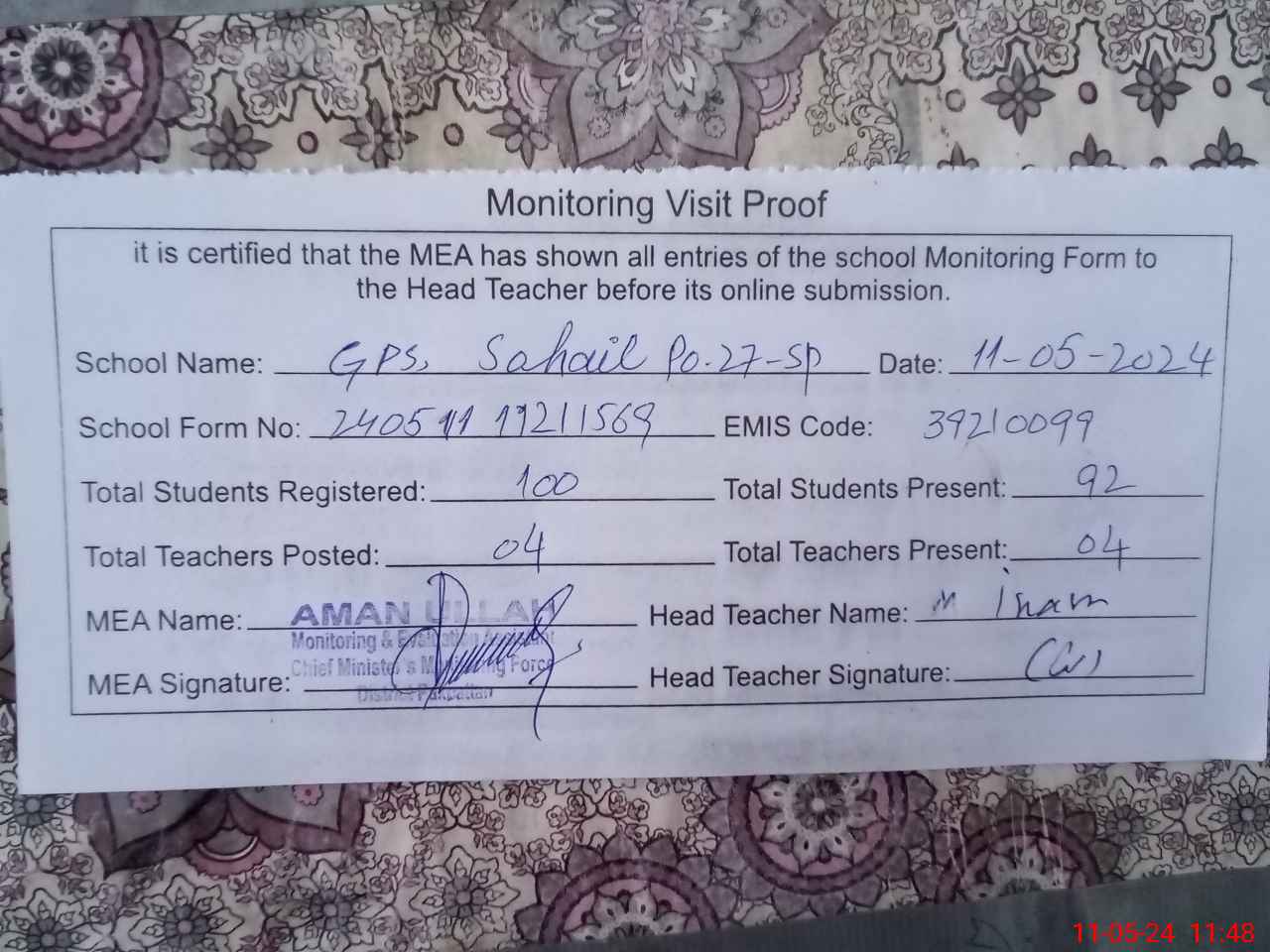 | Attendance Register | Head Teacher | MEA with School | Visit Proof |