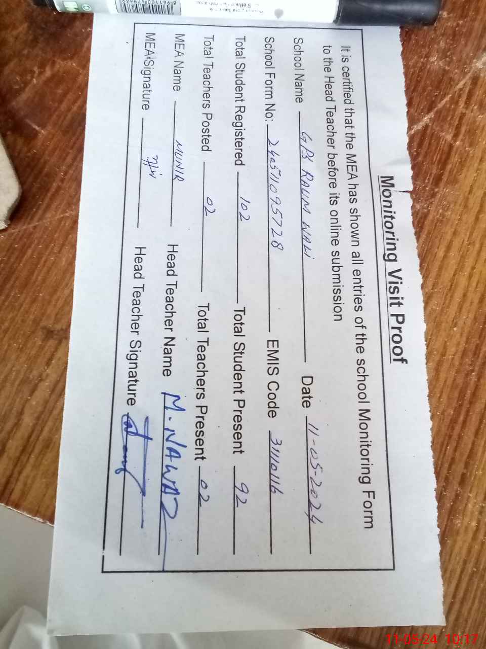 | Attendance Register | Head Teacher | MEA with School | Visit Proof |