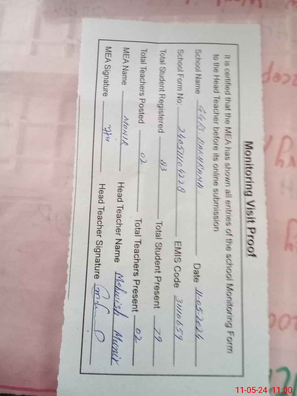| Attendance Register | Head Teacher | MEA with School | Visit Proof |