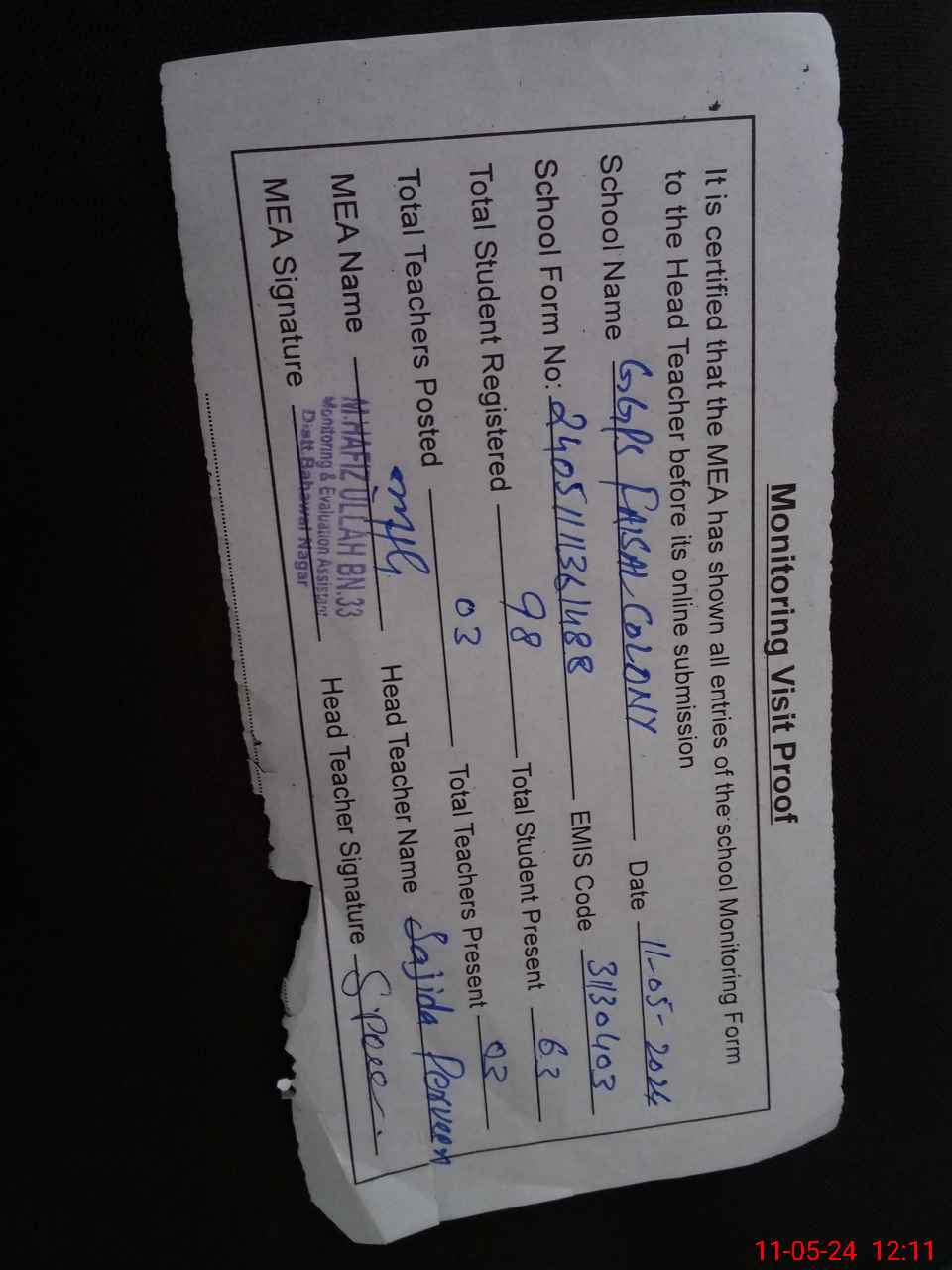 | Attendance Register | Head Teacher | MEA with School | Visit Proof |