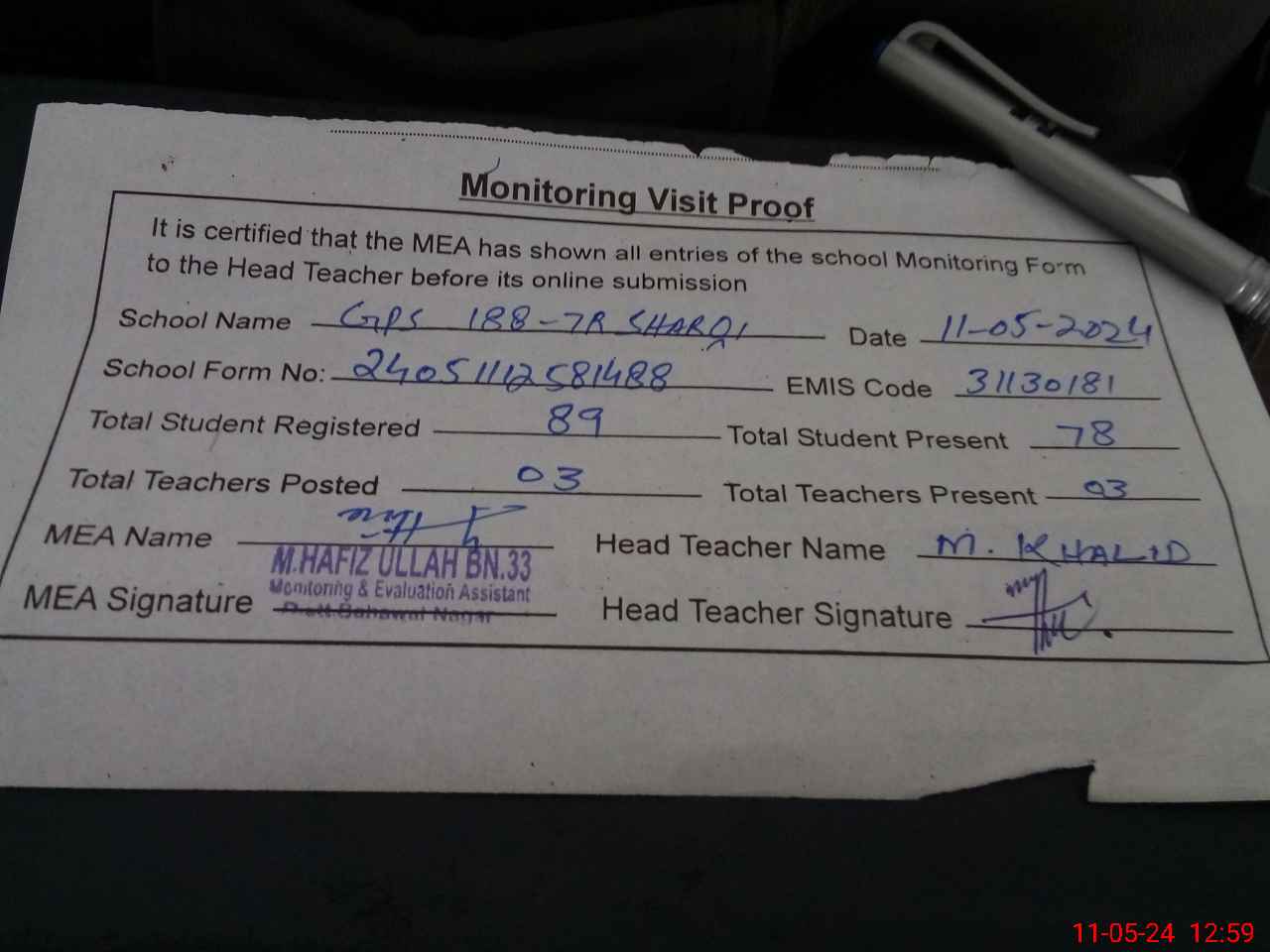 | Attendance Register | Head Teacher | MEA with School | Visit Proof |