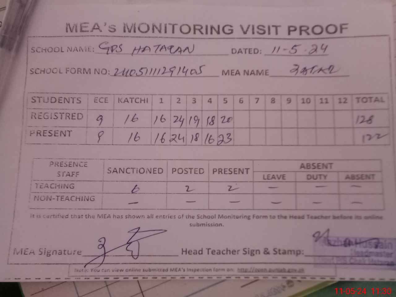 | Attendance Register | Head Teacher | MEA with School | Visit Proof |
