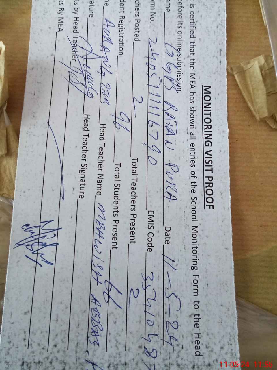 | Attendance Register | Head Teacher | MEA with School | Visit Proof |