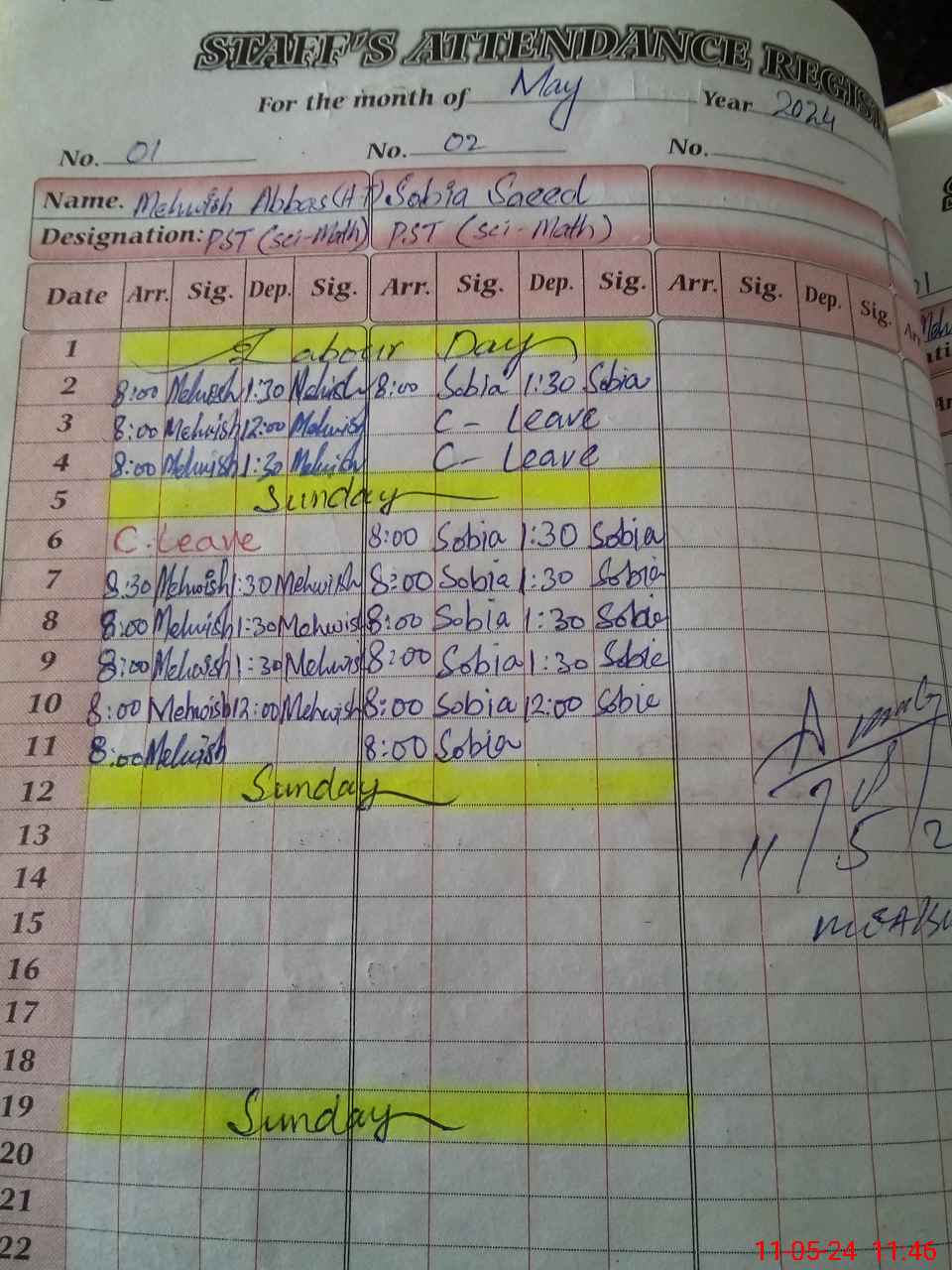 | CNIC | Full Name | Designation | R/C | Absence During Last Calender Month |