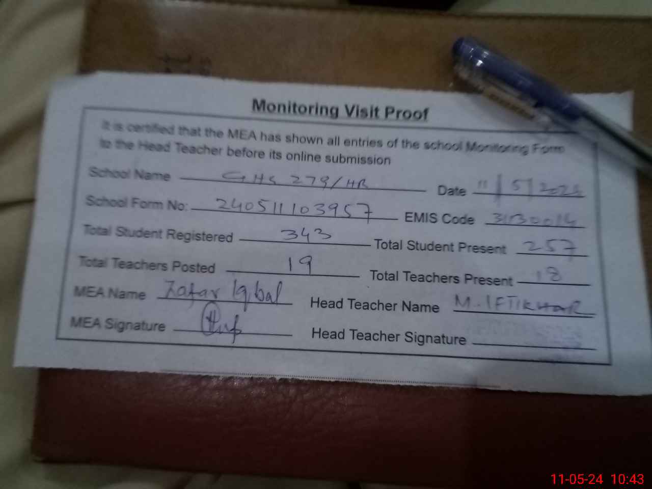 | Attendance Register | Head Teacher | MEA with School | Visit Proof |
