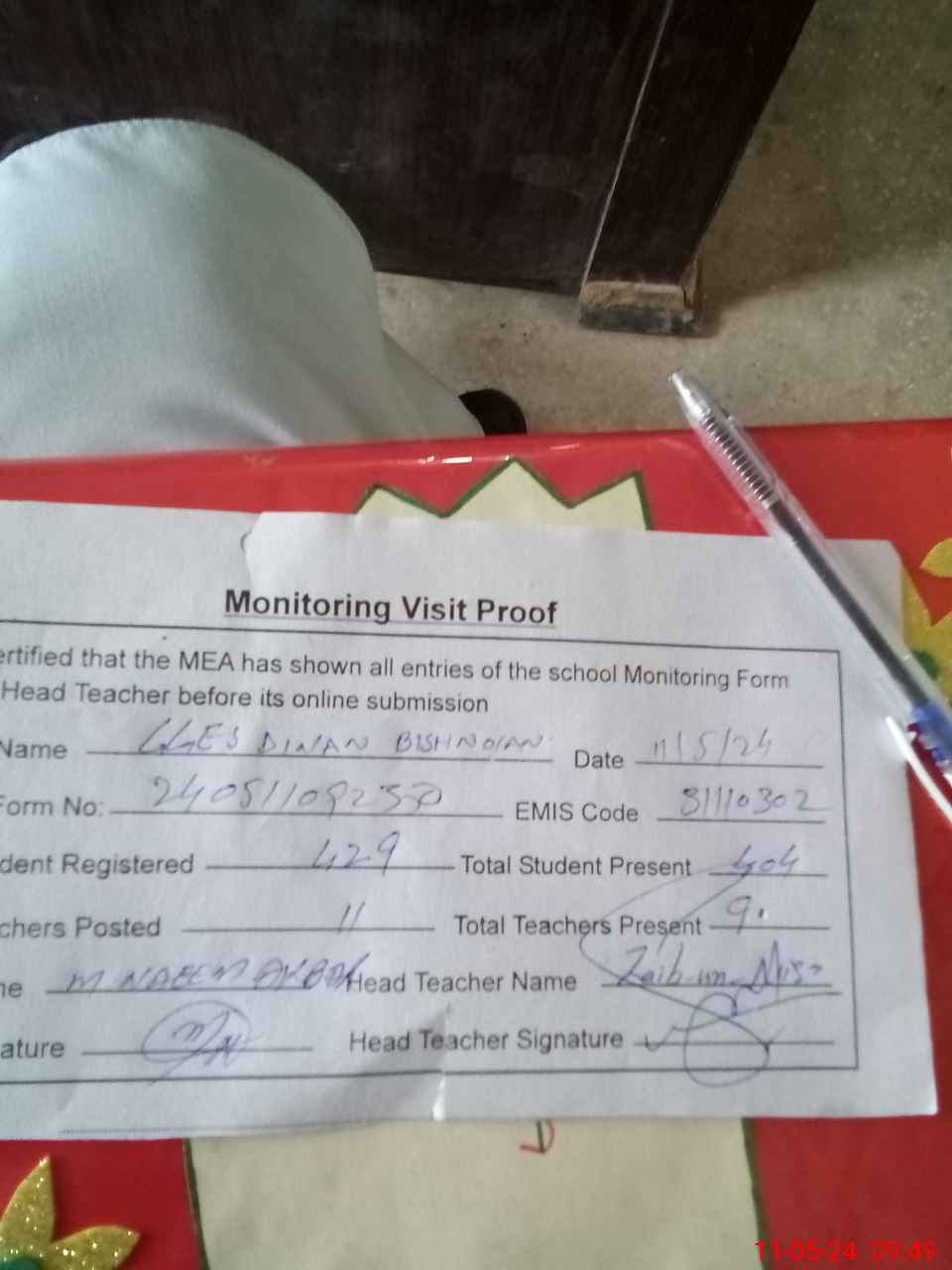 | Attendance Register | Head Teacher | MEA with School | Visit Proof |