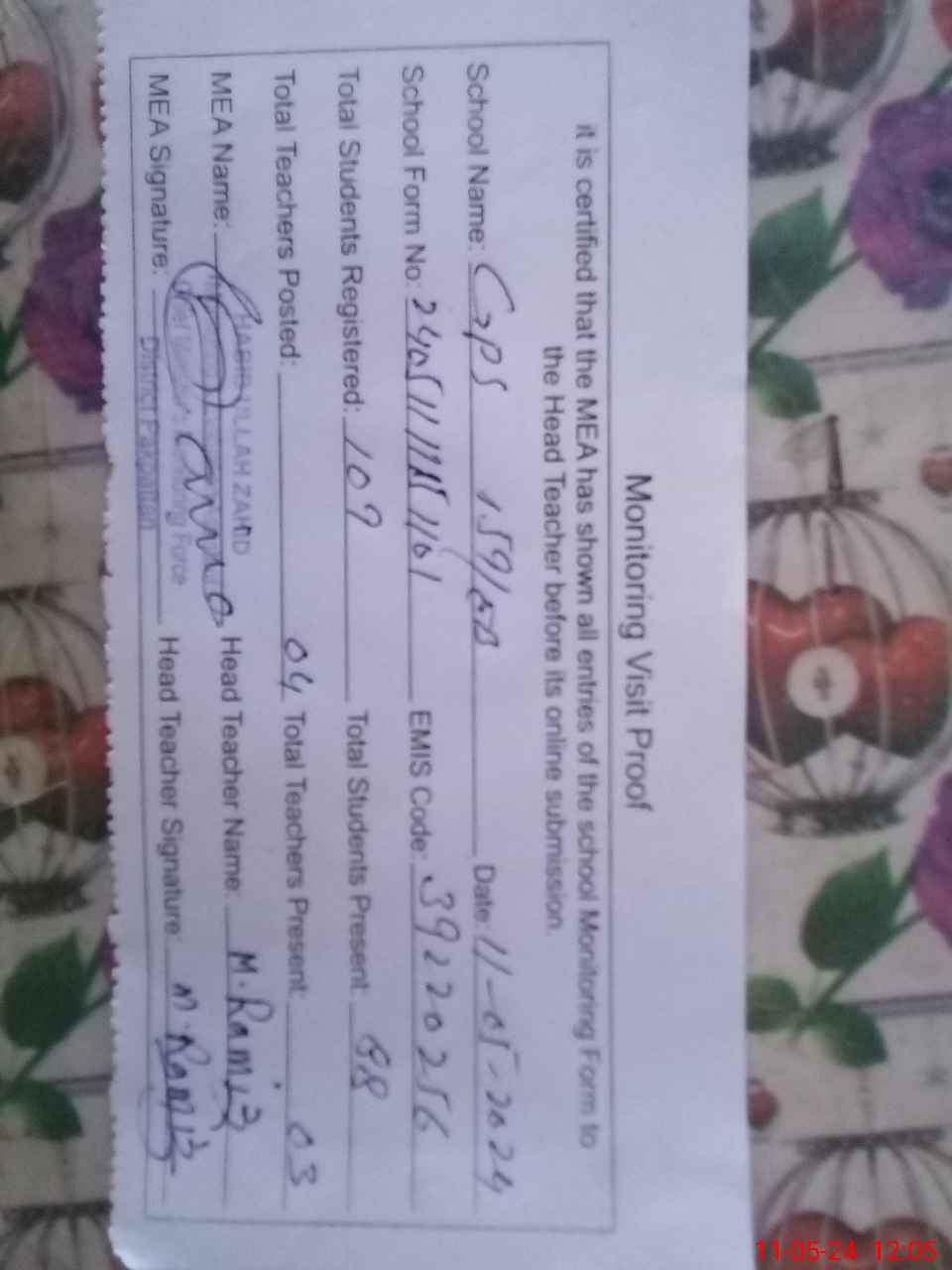 | Attendance Register | Head Teacher | MEA with School | Visit Proof |