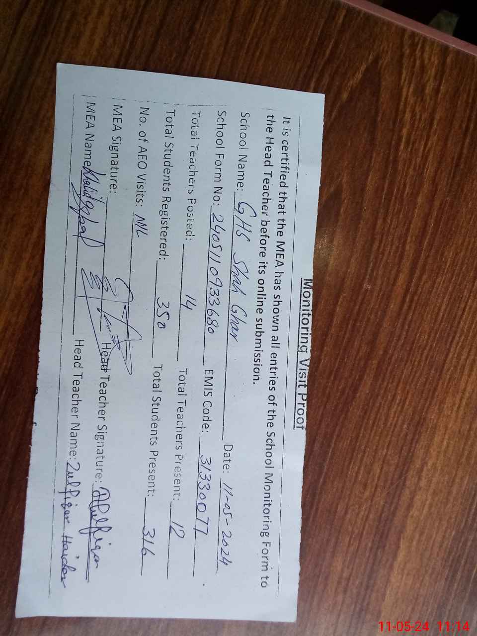 | Attendance Register | Head Teacher | MEA with School | Visit Proof |
