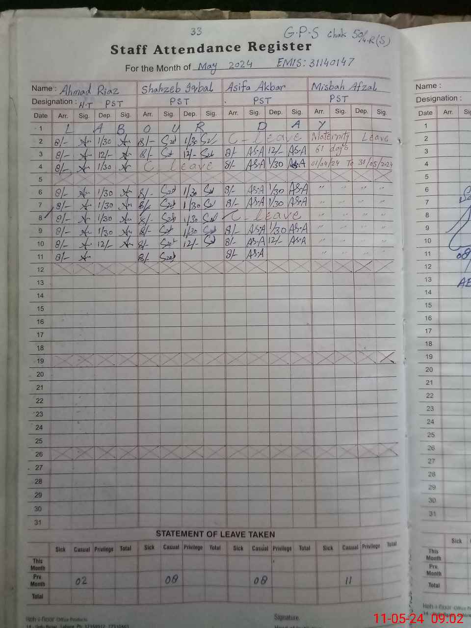 | Leave | Duty | Absent | Maternity | Medical | Ex- Pak |