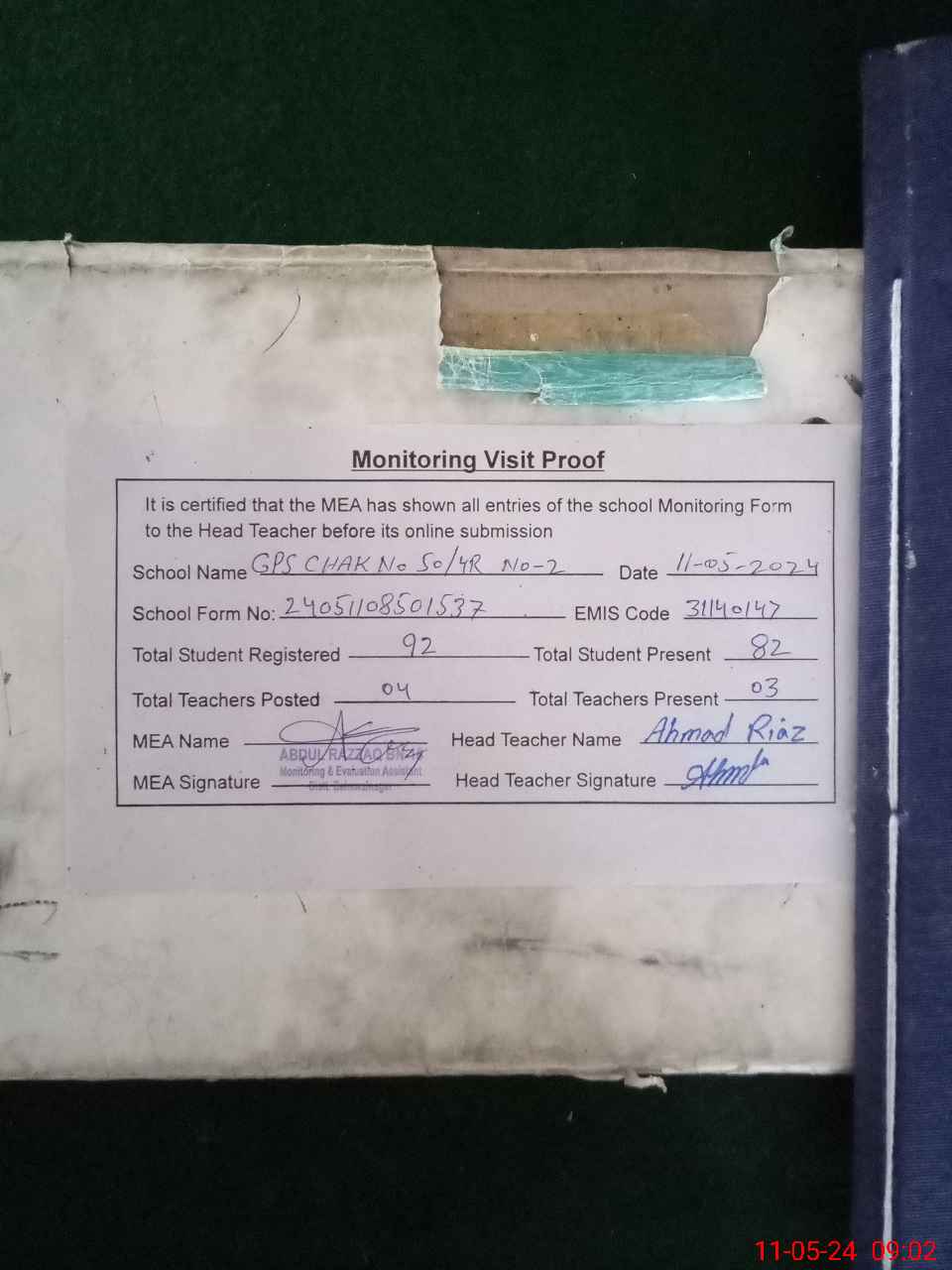| Attendance Register | Head Teacher | MEA with School | Visit Proof |
