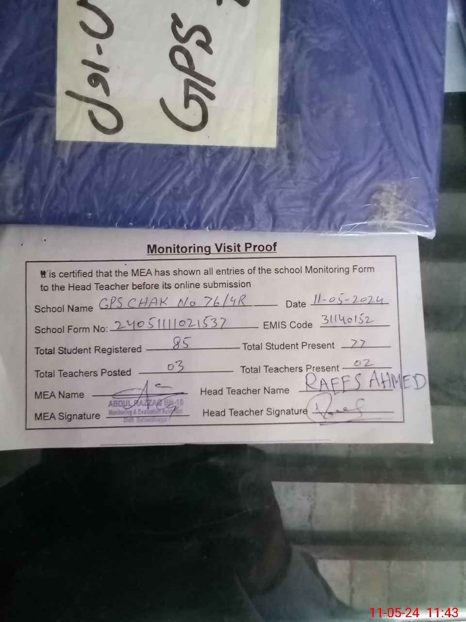 | EMIS Code: 31140152 | Name of School: GPS CHAK NO 76/4-R | |||