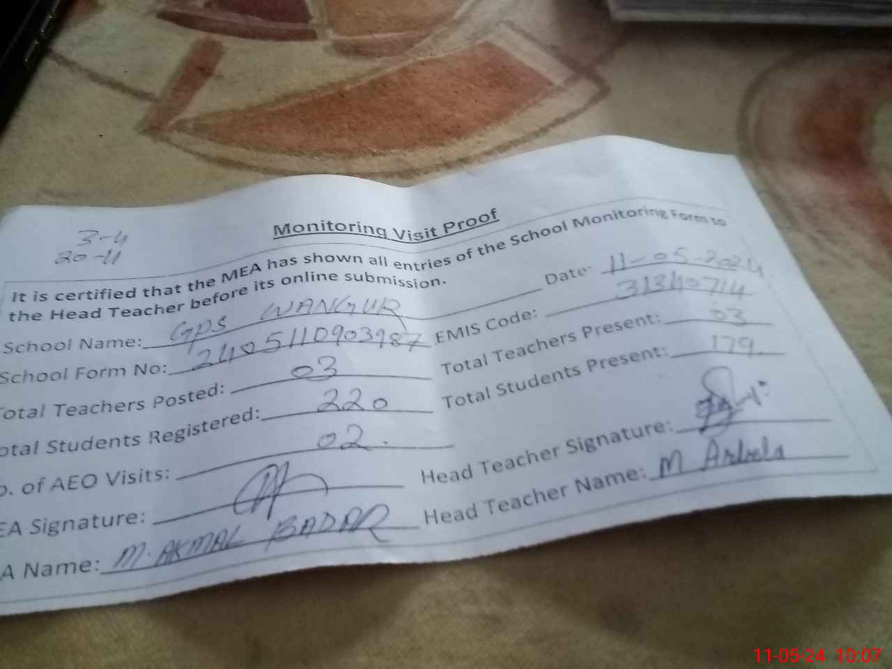 | Attendance Register | Head Teacher | MEA with School | Visit Proof |
