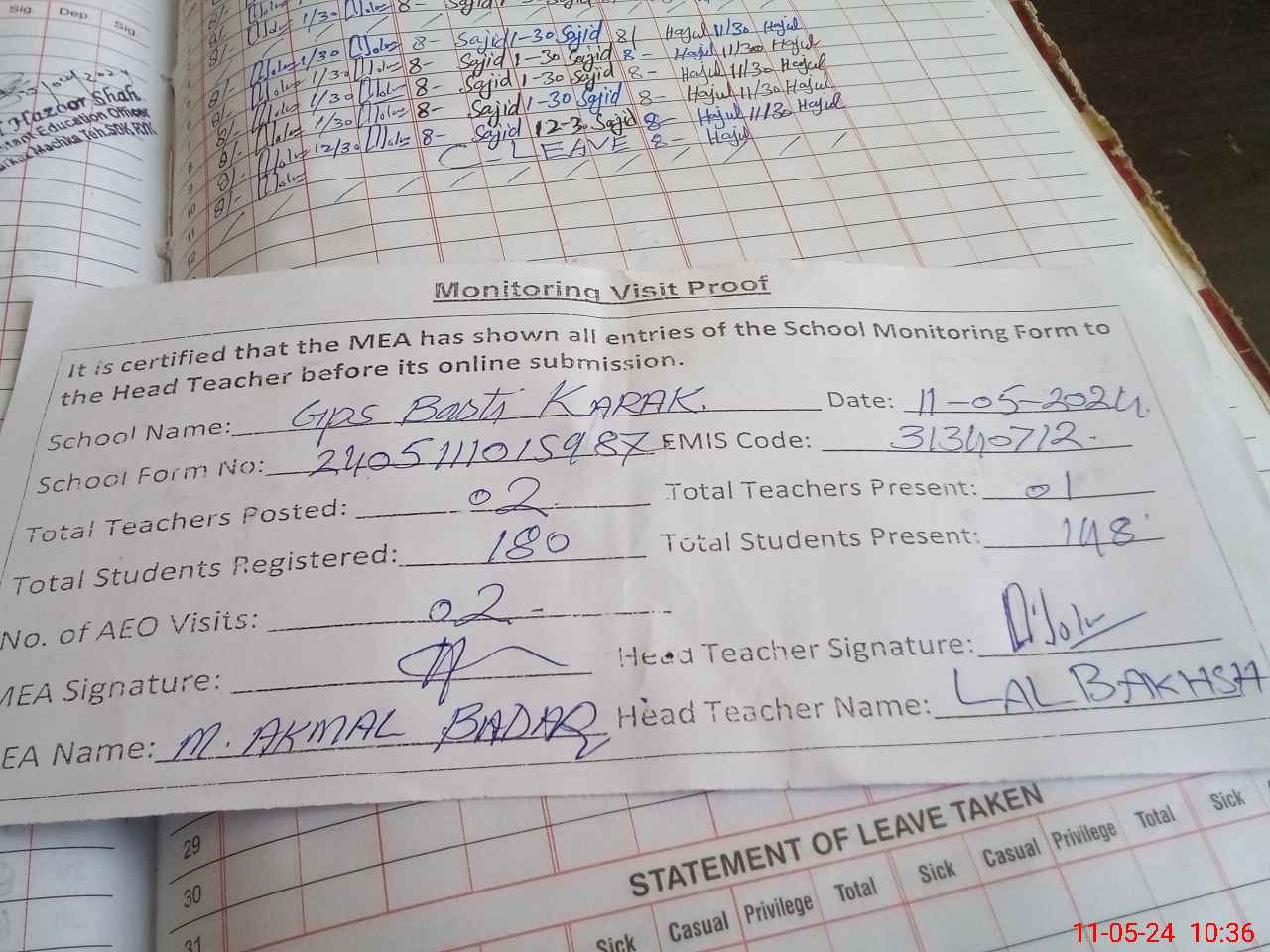 | Attendance Register | Head Teacher | MEA with School | Visit Proof |